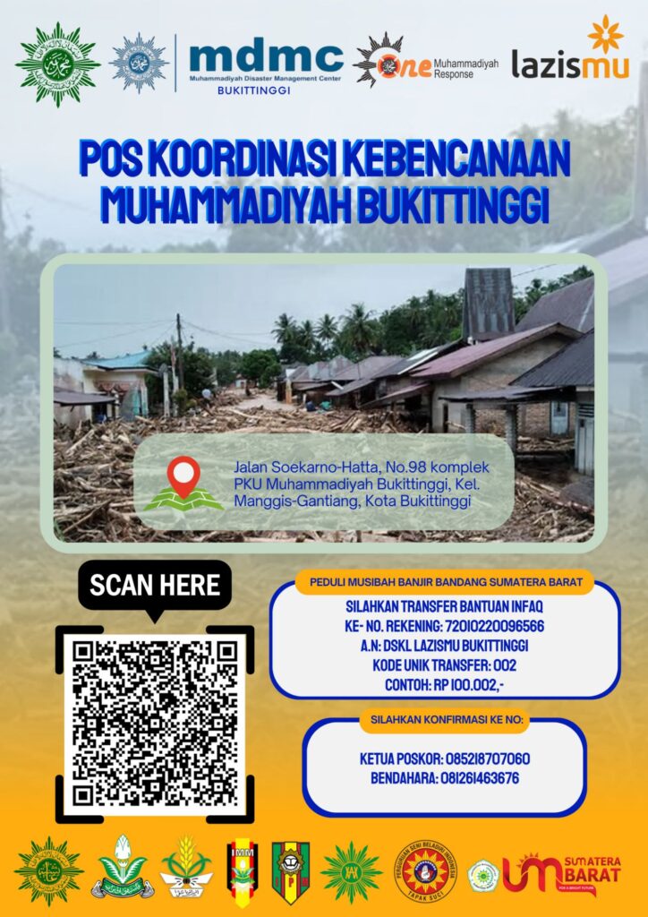 Bukittinggi, 11 Desember 2025 – Muhammadiyah Disaster Management Center (MDMC) Bukittinggi, bersama Lazismu Bukittinggi, meluncurkan bantuan kemanusiaan untuk korban bencana di empat kecamatan di Sumatera Barat, yaitu Malalak, Matur, IV Koto, dan Palupuah. Bantuan ini merupakan bagian dari program “One Muhammadiyah One Response” yang bertujuan untuk memberikan respons cepat dan bermartabat terhadap bencana.